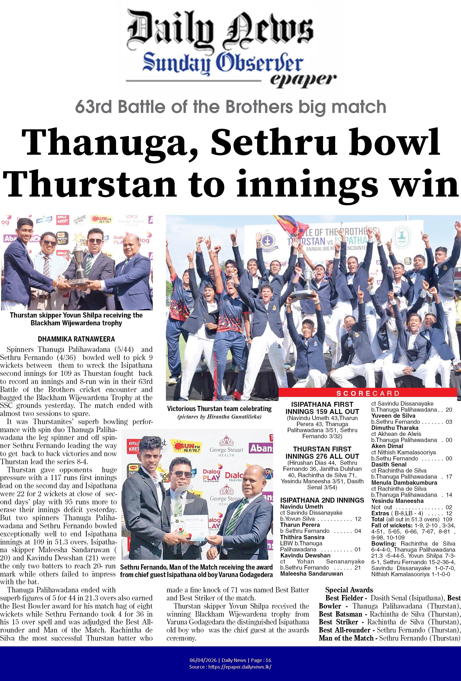 Spinners Thanuga Palihawadana (5/44) and Sethru Fernando (4/36) bowled well to pick 9 wickets between them to wreck the Isipathana second innings for 109 as Thurstan fought back to record an innings and 8-run win in their 63rd Battle of the Brothers cricket encounter and bagged the Blackham Wijewardena Trophy at the SSC grounds yesterday. The match ended with almost two sessions to spare.