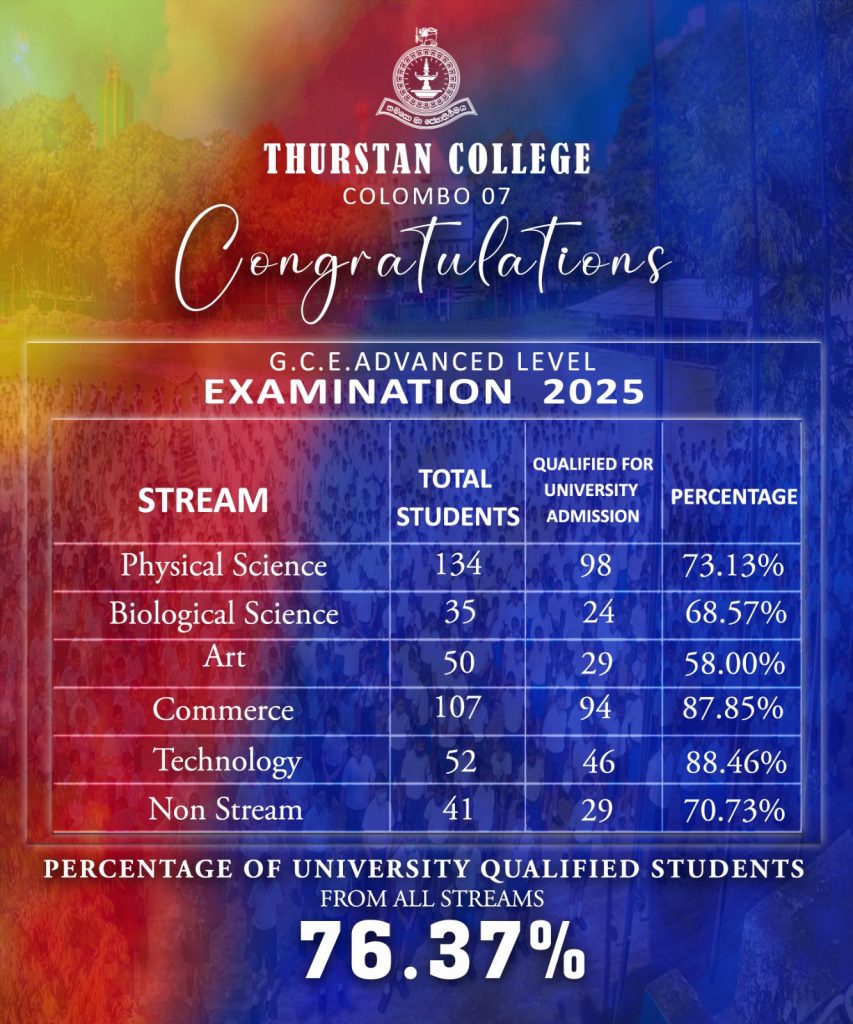 Congratulations to all students of Thurstan College on your outstanding achievement at the G.C.E. Advanced Level Examination 2025.