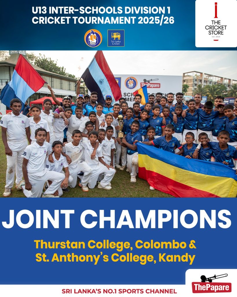 Categories Cricket News Thurstan College, Colombo and St. Anthony’s College, Kandy emerge joint champions of the U13 Inter-Schools Division 1 Cricket Tournament 2025/26 Post author By Editorial Team Post date January 27, 2026 No Comments on Thurstan College, Colombo and St. Anthony’s College, Kandy emerge joint champions of the U13 Inter-Schools Division 1 Cricket Tournament 2025/26 Spread the love ← THE BATTLE FOR AQUATIC SUPREMACY BEGINS Leave a Reply Cancel replyYour email address will not be published. Required fields are marked *Comment * Name * Email * Website Save my name, email, and website in this browser for the next time I comment. Are you human? Please solve: Δ